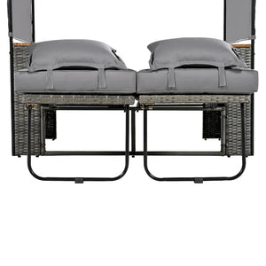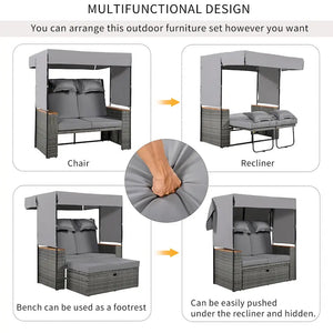 2-Piece Outdoor Patio Rattan Canopy Daybed Sunbed with 5 Positions Adjustable Backrest and Storage Bench
