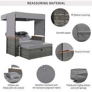 - Durable & Comfortable Materials: The daybeds frame is made of sturdy steel, with acacia wood armrests and a PE rattan surface, providing both durability and style. The cushions and backrests are filled with soft, elastic foam for superior comfort, and the pillows are filled with high-quality silk-cotton. The fabric is UV and weather-resistant polyester, ensuring long-lasting comfort even in outdoor conditions.