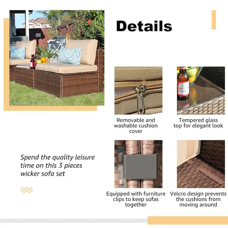 Elevate your outdoor gatherings with this stylish 3-piece patio sofa set. The cozy cushions and durable brown wicker create a warm and inviting atmosphere. Each piece features a powder-coated steel frame for year-round sturdiness. The side table with tempered glass top adds both function and style to the set. With removable and washable cushion covers, this set is designed for comfort and convenience.