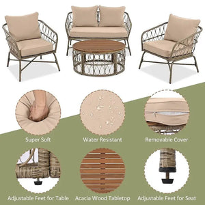 Transformez votre espace extérieur avec notre salon de jardin 4 places d'inspiration bohème. Confectionné en résine tressée pour une ambiance moderne et naturelle, il offre des assises généreuses pour un confort optimal. Les coussins déhoussables et résistants à l'eau facilitent l'entretien, tandis que le plateau ovale unique en bois d'acacia apporte beauté et fonctionnalité à votre terrasse ou jardin.