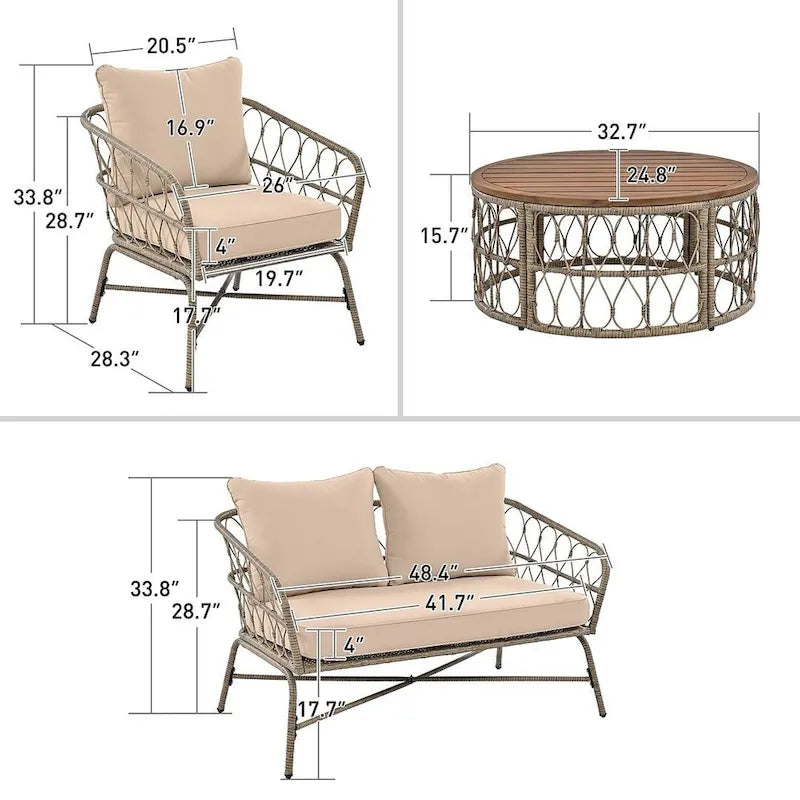 - Éléments inclus : 1 table, 2 fauteuils, 1 canapé deux places