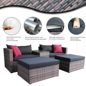 5 Pieces Outdoor Patio Garden Brown Wicker Sectional Conversation Sofa Set with Black Cushions and Red Pillows