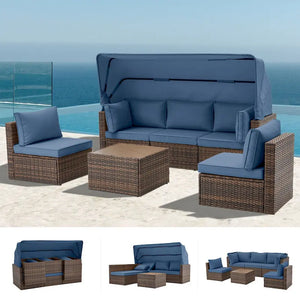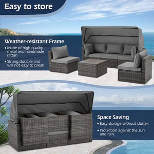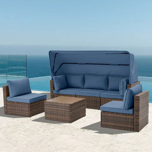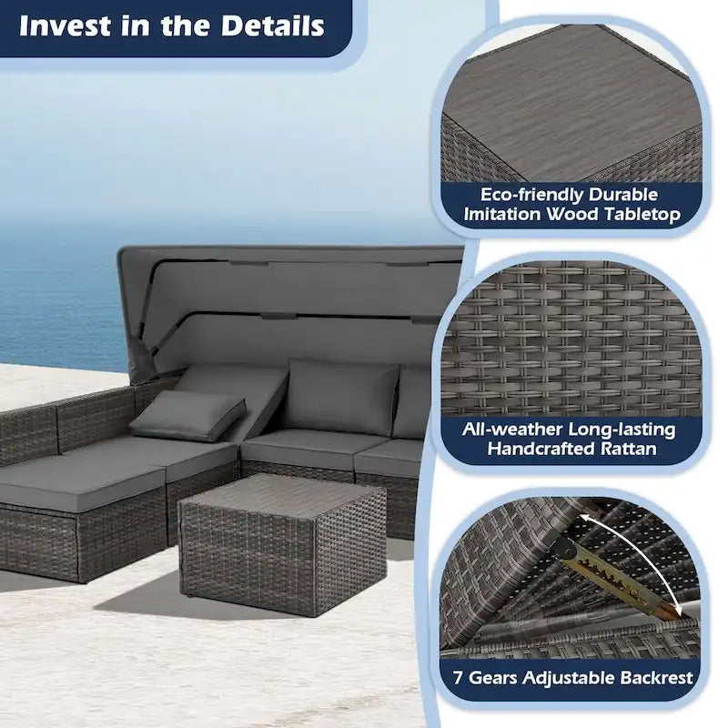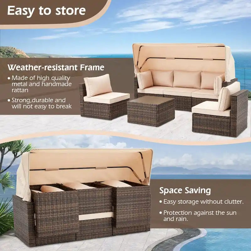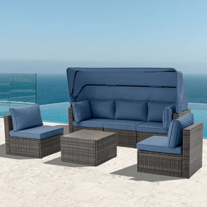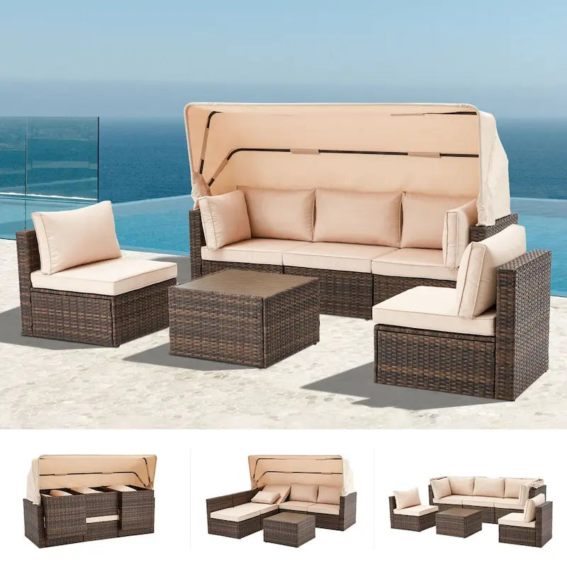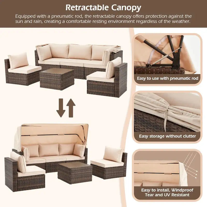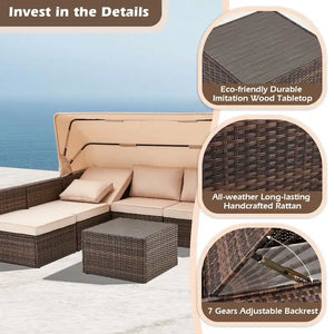 6-Piece Handwoven Rattan Wicker Outdoor Sectional Sofa Set with Cushions and Adjustable Canopy and Backrest