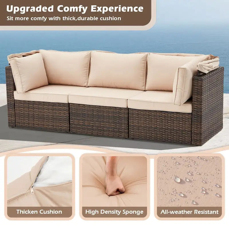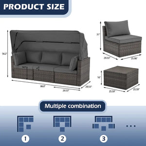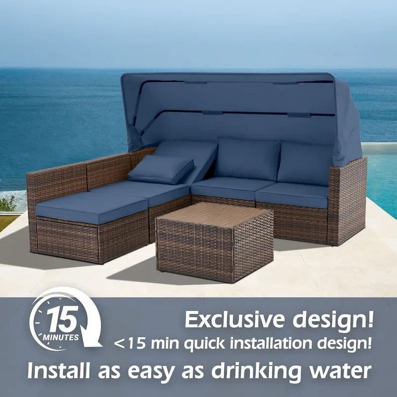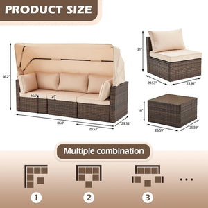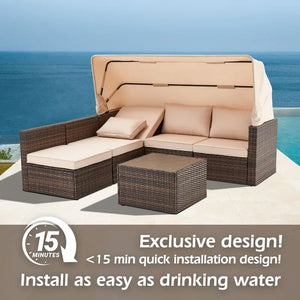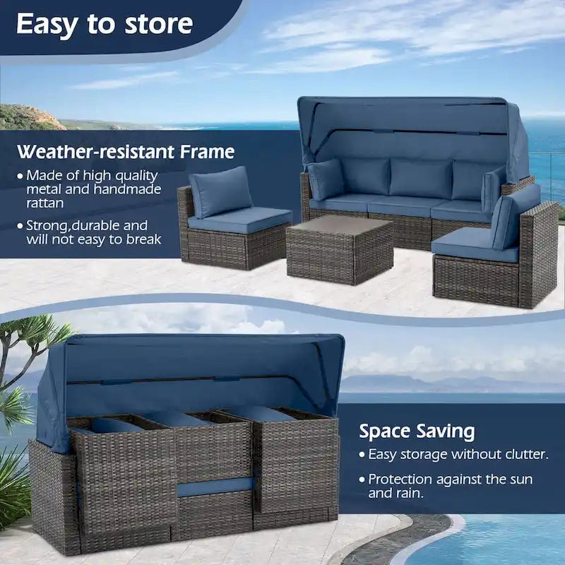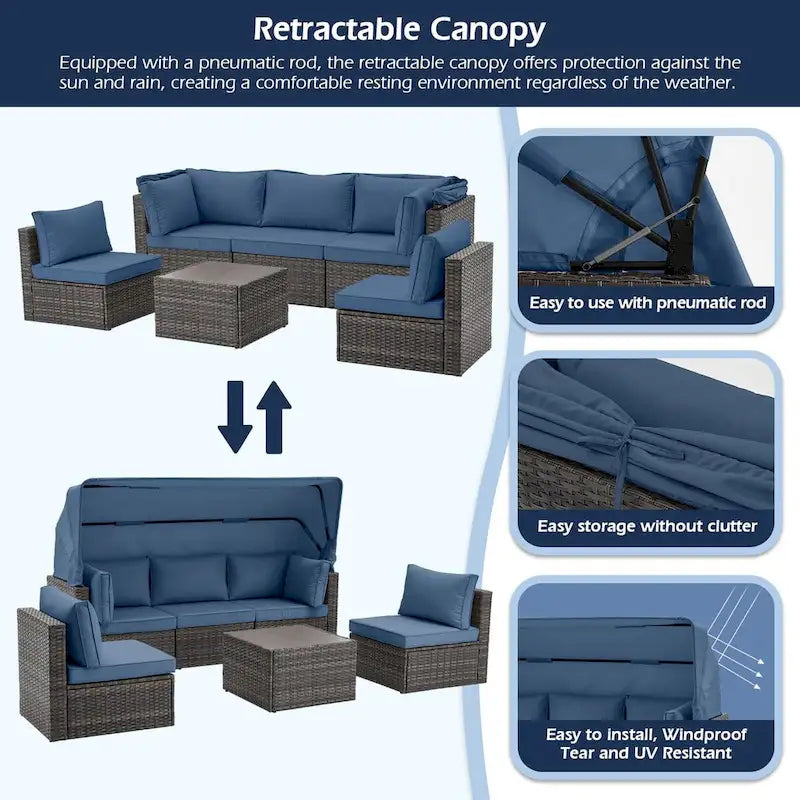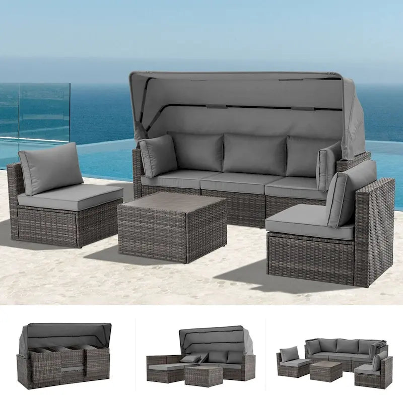 6-Piece Handwoven Rattan Wicker Outdoor Sectional Sofa Set with Cushions and Adjustable Canopy and Backrest