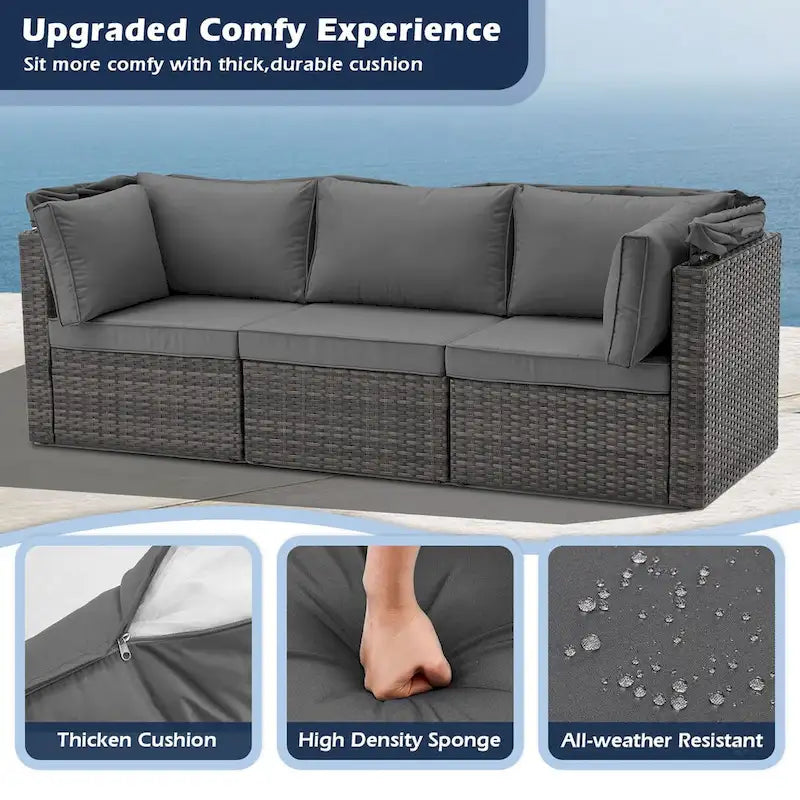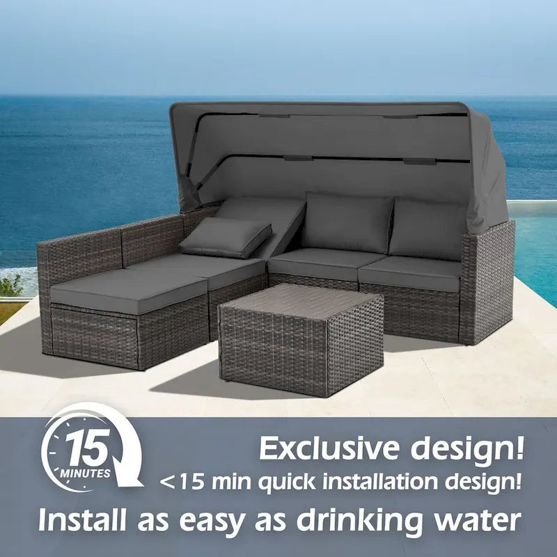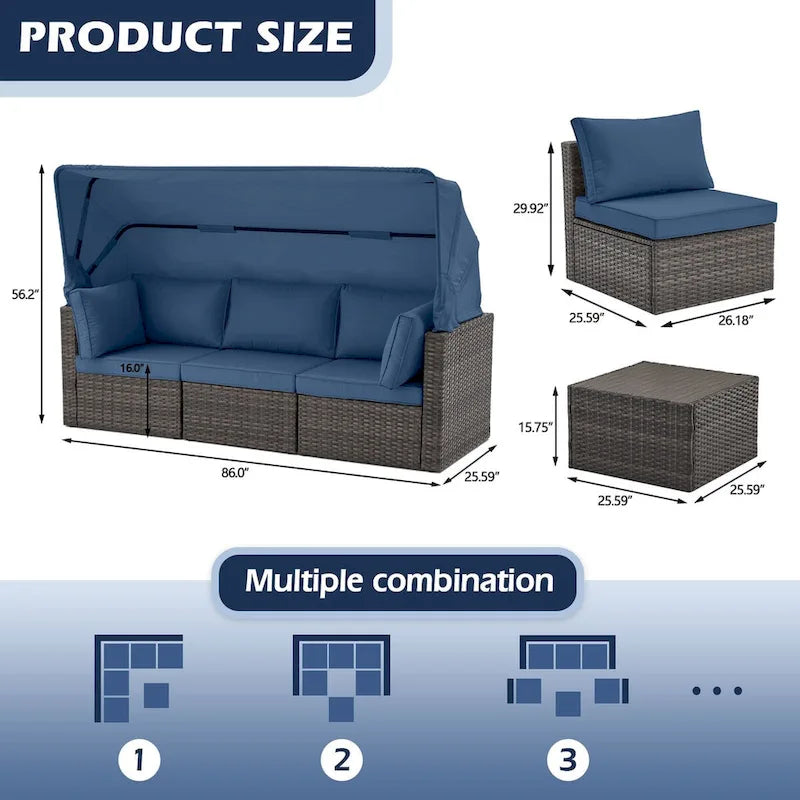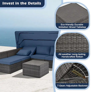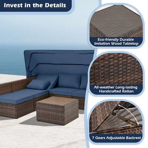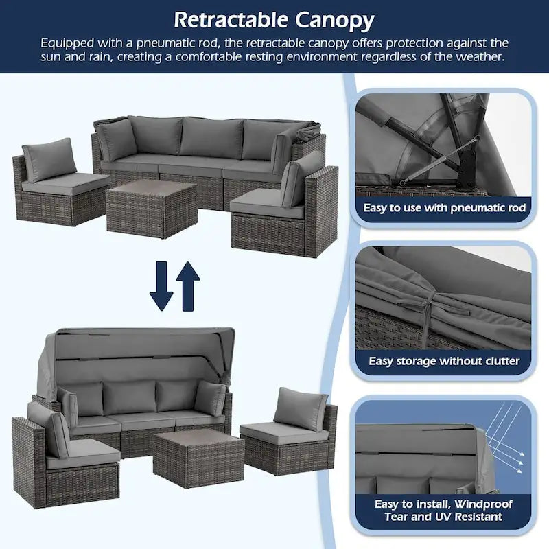 - This lovely set comes with a retractable canopy and one corner seat with a 7-position reclining backrest, so you can enjoy all your luxurious leisure time in comfort