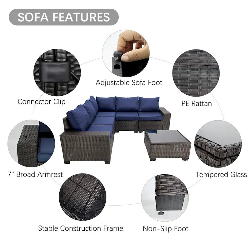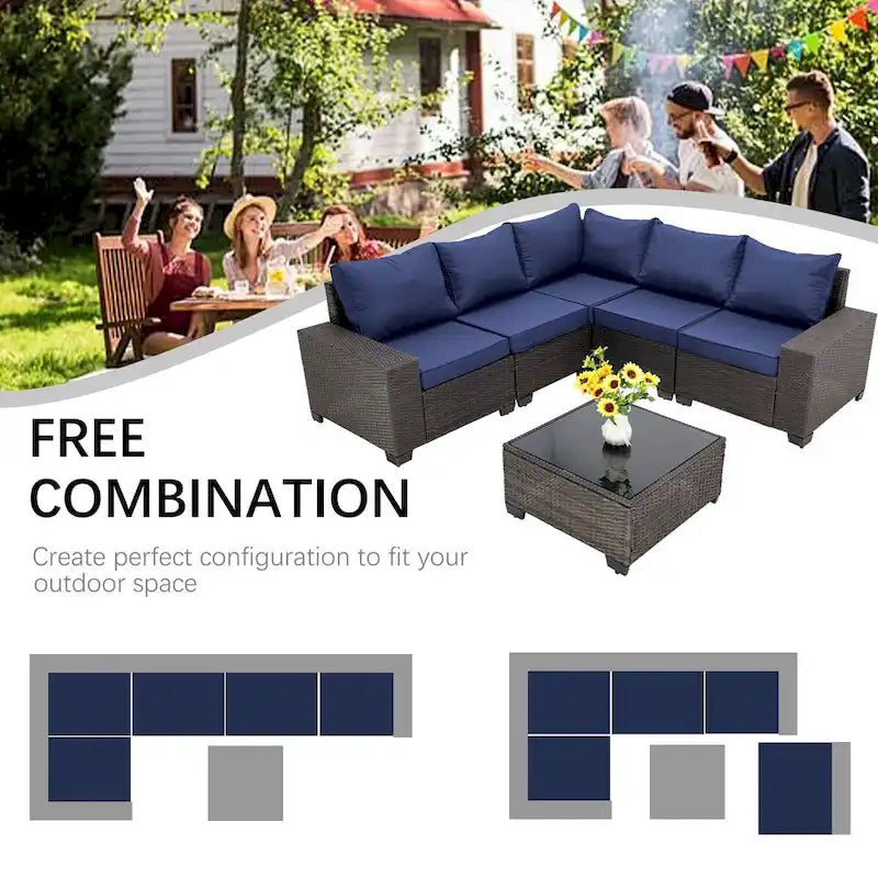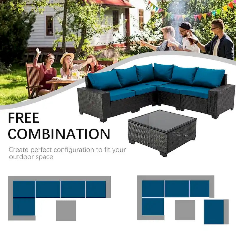 This outdoor modular sofa set includes 1 corner chair, 4 armless chairs and 1 glass top coffee table, providing flexibility and multiple layout combinations. The modular seats are connected to each other by connecting clips, so they will not fall apart. Made of high-quality wicker and rattan, our furniture is durable and designed to provide maximum comfort. The wicker in the all-weather design is also roughened to make it more realistic and closer to nature.