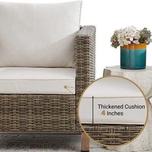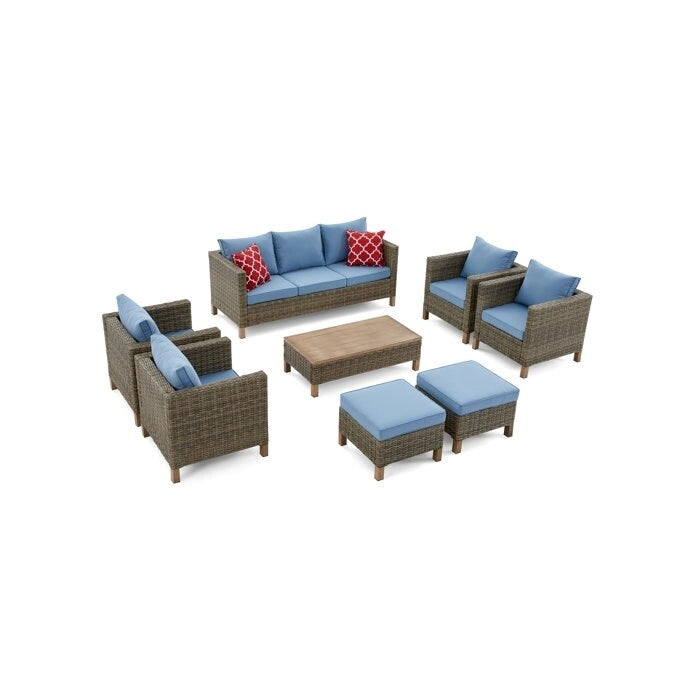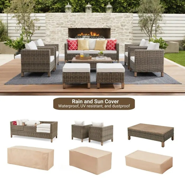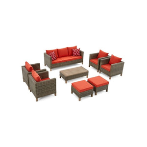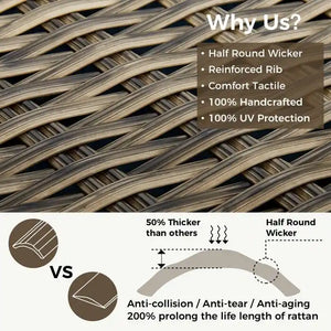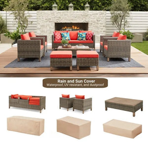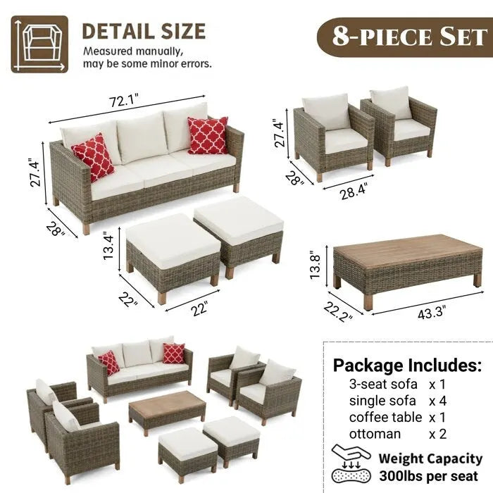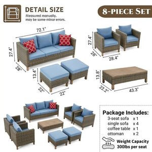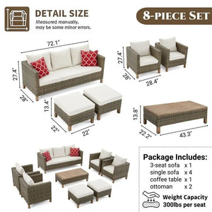 The patio furniture set is elegant and spacious seating space is wide and sturdy. Includes a 3-seat sofa, 4 lounge chairs, 2 ottomans and 1 coffee table with 16 cushions and 2 toss pillows. It transforms the touch of life into a meticulous taste, which is in line with the human scale. Made with high-quality resin wicker that brings a sleek and exotic look to your space, this durable wicker naturally withstands outdoor elements and will not darken over timewhich is perfect as a solid, heavy frame that resists wear and tear. The cushions are attractive and easy to clean with zippered covers, but please keep cushions inside for rainy days, otherwise rain will infiltrate into the cushion fabric if it is in rain for long time. Comfortable, luxurious atmosphere, elegant and romantic, thick sponge cushion, giving people a strong lumbar support. for green life, our outdoor furniture set is really a good choice for you.