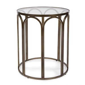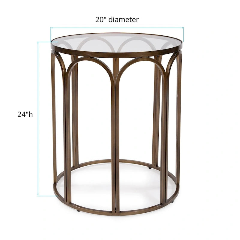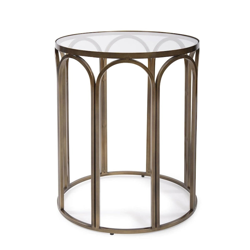 Transport yourself to the elegance of the early 18th century with the exquisite Allan Andrews Round Side Table, inspired by the graceful arches of that bygone era's windows. Immerse your space in sophistication with this meticulously crafted piece, featuring a hand-rubbed bronze finish that not only accentuates the captivating curvature but also infuses richness and tactile luxury into the overall aesthetic. This table is topped with clear tempered glass.