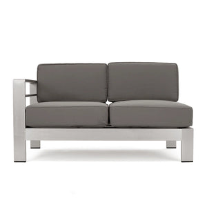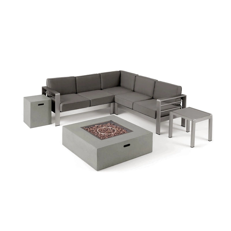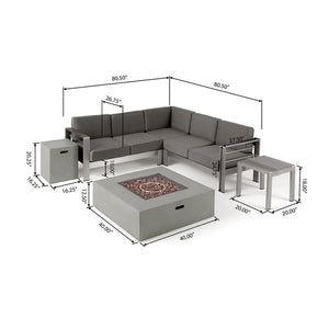 - Includes: One (1) Left Arm Sofa, One (1) Right Arm Sofa, One (1) Corner Seat, One (1) Side Table, One (1) Fire Pit, and One (1) Tank Holder
