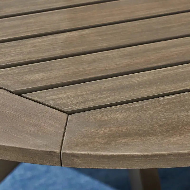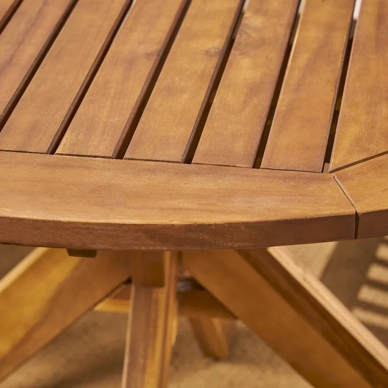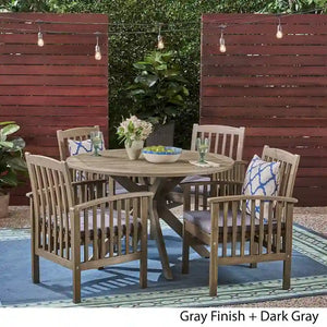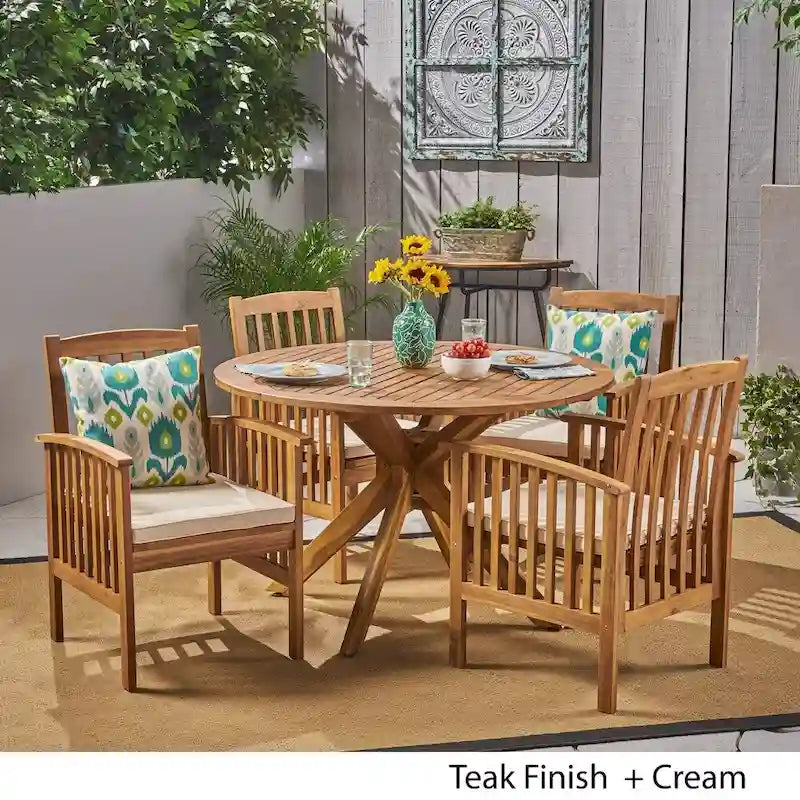 Style your outdoor space with the Casa dining set from Christopher Knight Home. The acacia wood set includes a round table with x-shaped legs, along with four slatted arm chairs. Water-resistant polyester cushions are included for durable comfort.