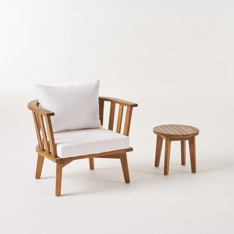 Enjoy the warm weather to the fullest with this Chilian outdoor club chair and side table set by Christopher Knight Home. Crafted from acacia wood for reliable sturdiness, this set has a natural finish for a casual vibe. The cushions are water resistant for durability outdoors, and the chairs have a curved frame for comfort.