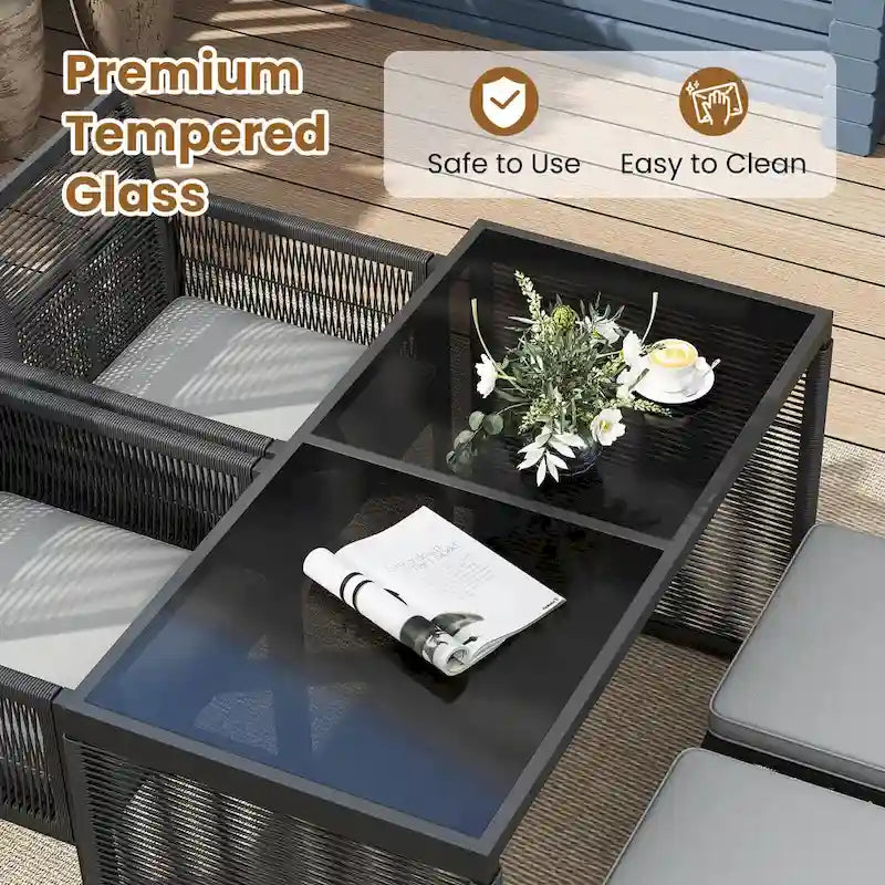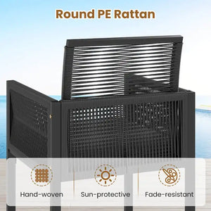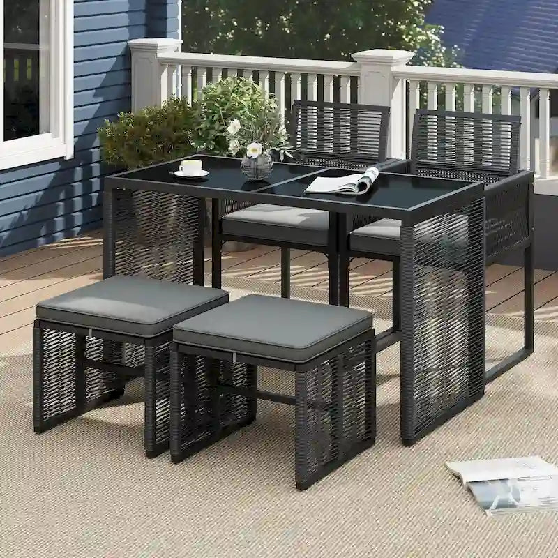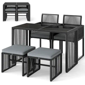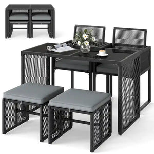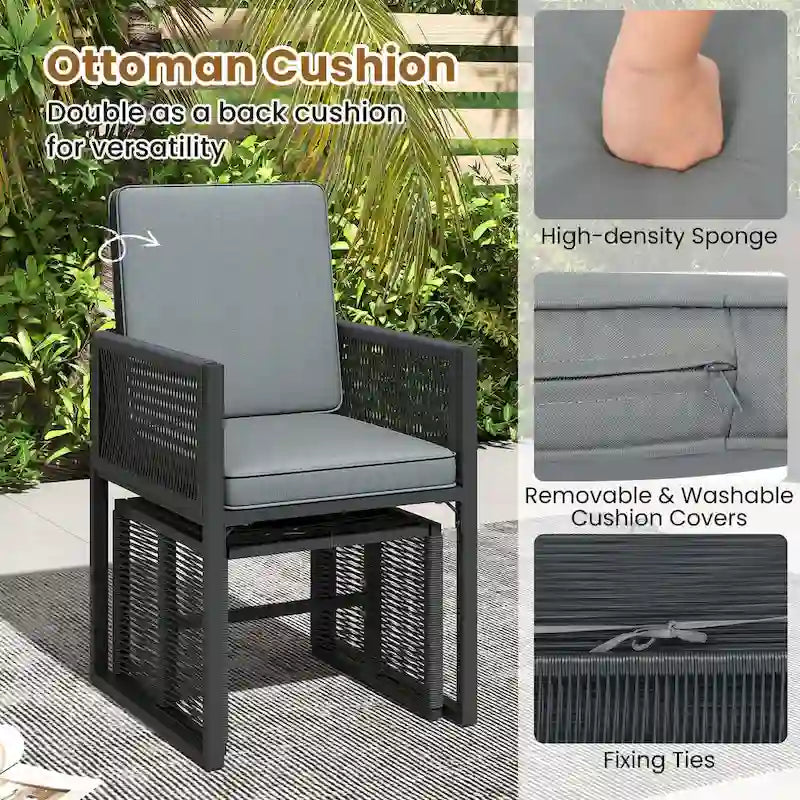 The outdoor patio furniture set includes 2 armchairs with soft, removable cushions and 2 robust ottomans that can also serve as additional seating, each supporting up to 400 lbs. Space is never an issue as the innovative design allows you to tuck the ottomans under the chairs and fold the backrests to slide everything neatly under the sleek, tempered glass table. Each piece of this patio bistro set is crafted with hand-woven, round PE wicker, ensuring sun protection and fade resistance, making this patio set an ideal choice for sprucing up your garden, backyard or poolside.