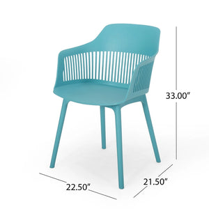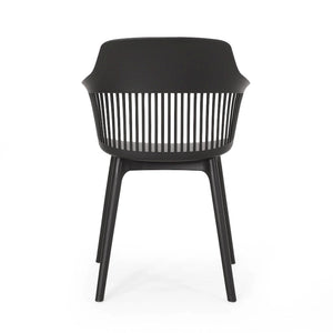 Modern lines and durable construction make this dining chair set an ideal choice for your outdoor dining space. Each chair is crafted from weather-resistant polypropylene resin, available in your choice of black or teal. The rounded back curves down into the integrated arms, clean cut-out lines adding a contemporary vibe to this beautiful dining chair set.