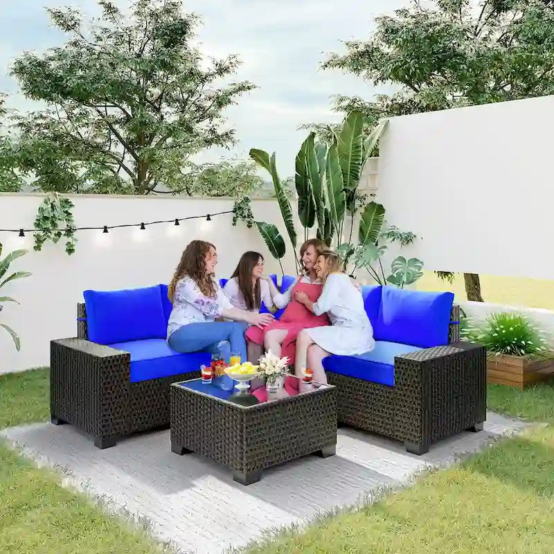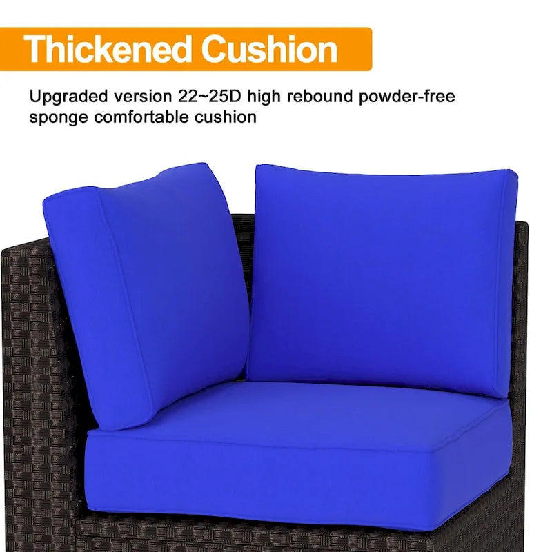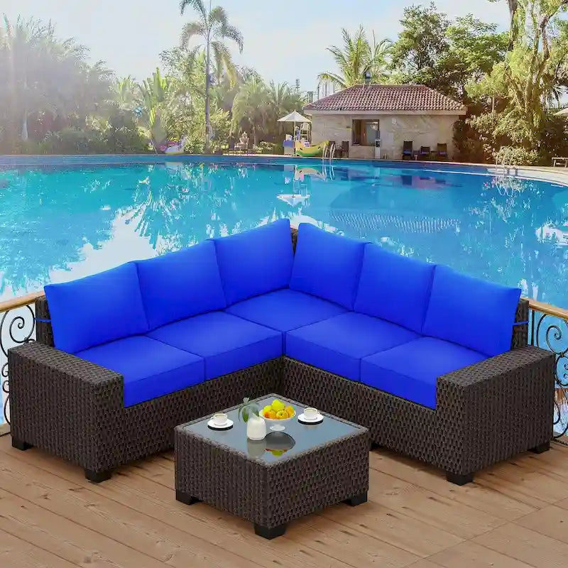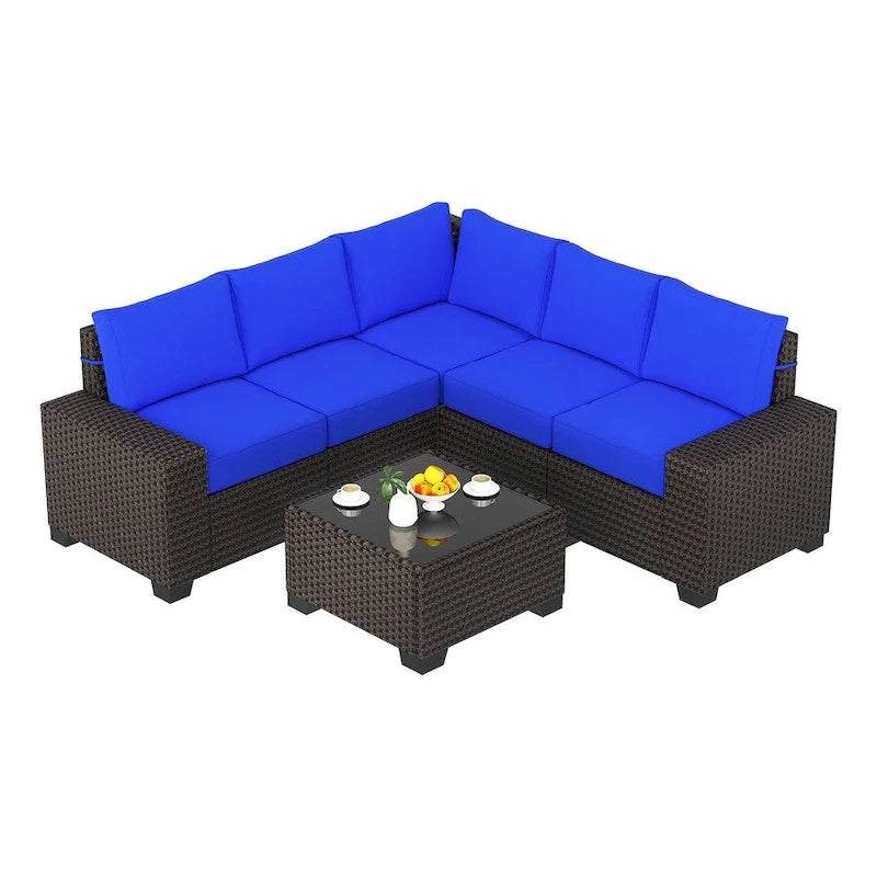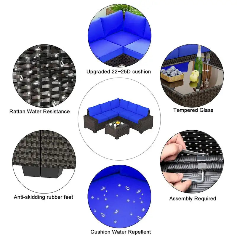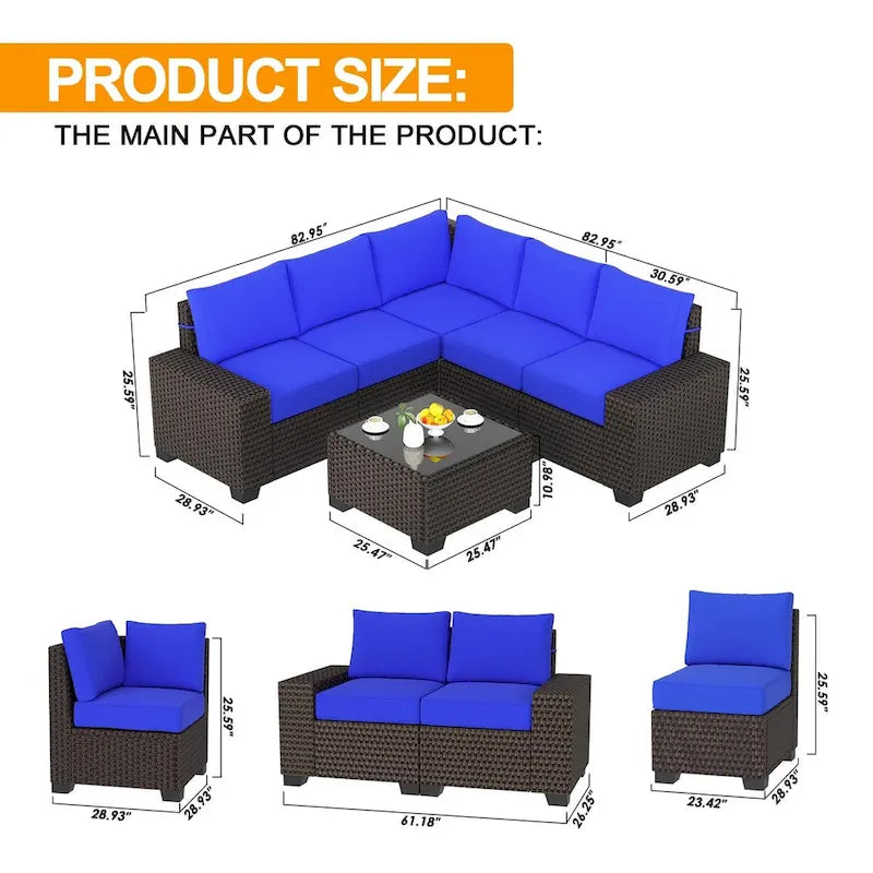 Relax and entertain in style with the 6-piece Outdoor Patio Furniture Wicker Sectional Sofa Set. This elegant set includes a five-piece sectional sofa and a glass-topped coffee table, perfect for outdoor gatherings or lounging with family and friends. The rust-resistant powder-coated steel frame and natural-looking all-weather synthetic PE resin wicker ensure durability and longevity. Available in beige or blue, the polyester cushion covers feature superior poly-fiber fabric that is removable, washable, and easy to put back on. The cushion pillow is made of water-repellent material. Perfect for enhancing your yard, poolside, balcony, patio, and indoor spaces, these sets offer exceptional comfort as you unwind and relax in style during your leisure moments. The color of the product may vary under different light conditions.