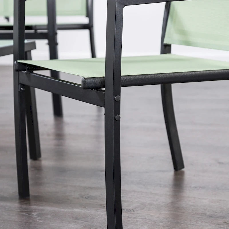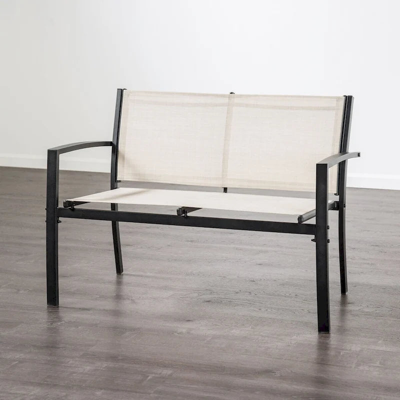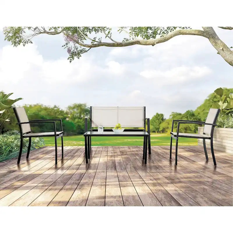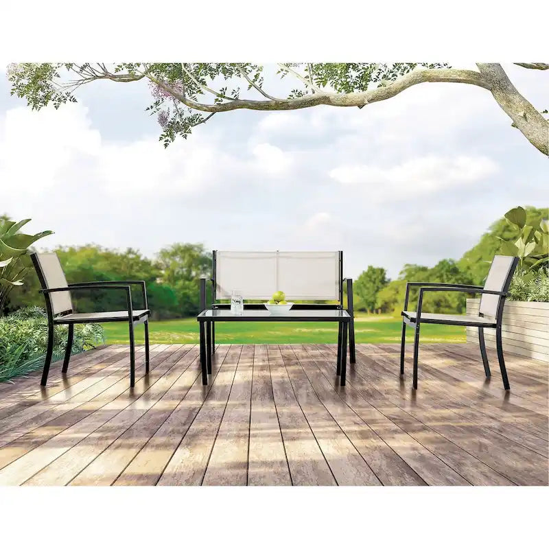 Enhance your outdoor living space with the Norm 4-piece sling outdoor set, complete with 2 chairs, 1 loveseat, and 1 coffee table. Crafted with a sturdy metal frame and durable sling fabric, the chairs and loveseat offer comfortable seating, while the coffee table features a tempered glass top for a sleek and modern look. Perfect for lounging and entertaining, this set combines style, comfort, and durability to elevate your outdoor experience.