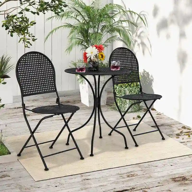 There is nothing will make you feel better than sinking into a comfortable bistro set with a crisp drink after a long day work. It is made of heavy-duty metal frame that combines long-lasting performance and great sturdiness. Besides, ergonomic backrest and comfortable armrest will completely make your body relaxed and indulge in wonderful outdoor leisure time. Likewise, the smooth tabletop is easy to clean which also provides additional space to hold drinks and food. With simple and modern style, the patio furniture set is a good decoration and brings beauty for outdoor and indoor occasions including porch, backyard, and patio, etc.