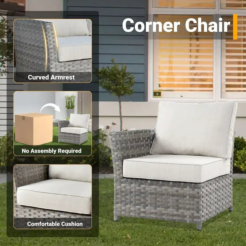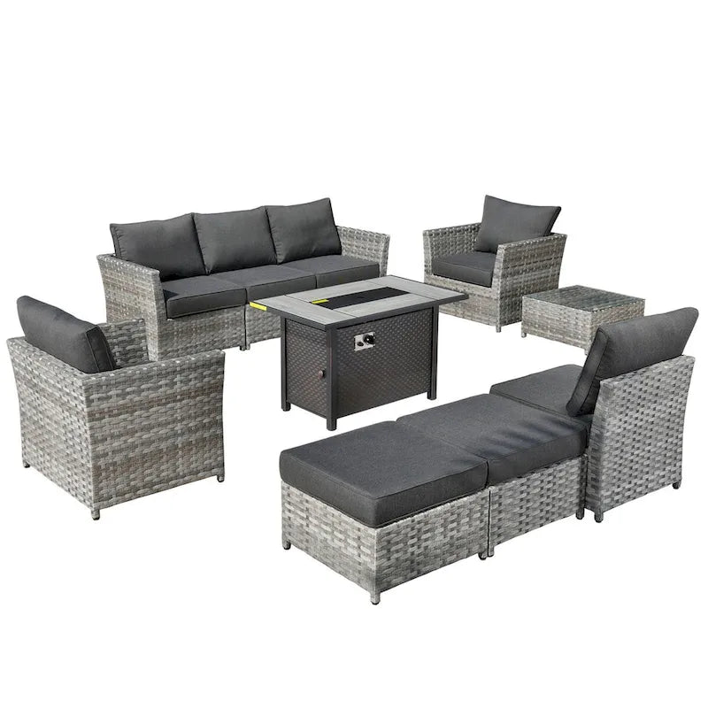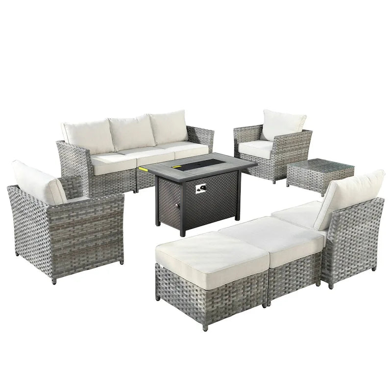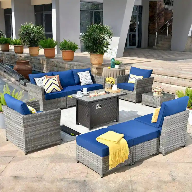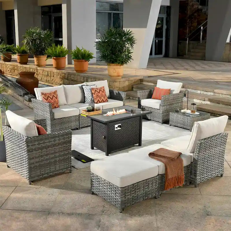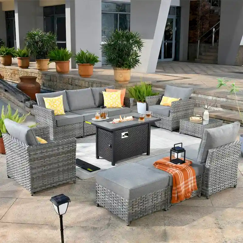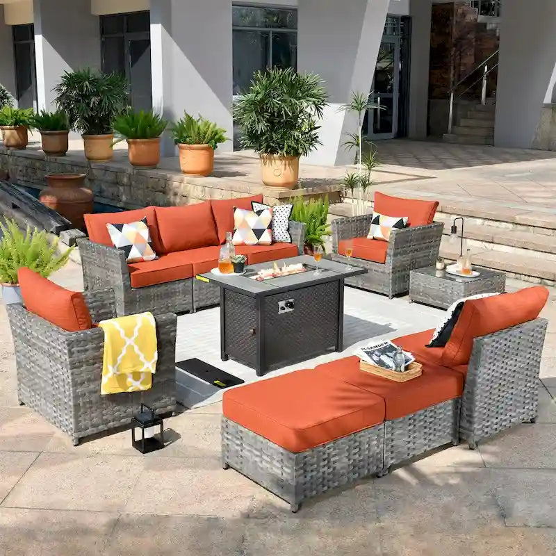 Elevate your outdoor living space with HOOOWOOO 10-piece Wicker Patio Furniture Sectional Set with Steel Fire Pit Table. This set boasts a modern and ergonomic design, handwoven sturdy wicker for a stylish and nature look. The thick and soft cushions provide unmatched comfort and support., while the fire pit table with steel construction, can produce a maximum heat output of 50,000 BTU to keep you warm and toasty. Enjoy the ultimate relaxation with this set , which comes with two corner chairs, two armless chairs, two single chairs, two ottomans, one coffee table and one fire pit table.