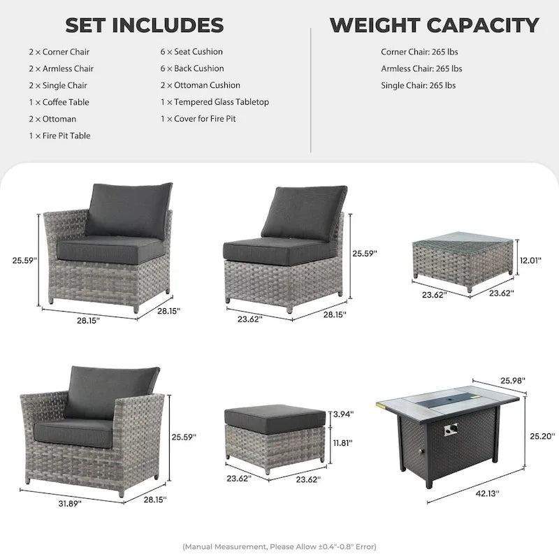 - Comes with 2 corner chairs, 2 armless chairs, 2 single chairs, 2 ottomans, 1 coffee table and 1 fire pit table