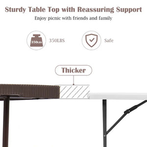 Our attractively designed rattan folding table will add some pizzazz to your indoor and outdoor space. The brown surface blends with a variety of decor. Stow it out of the way when not in use, and easily set it up when needed for a holiday dinner, buffet, garage sale, or any other activity. You'll turn to this table for help over and over again.