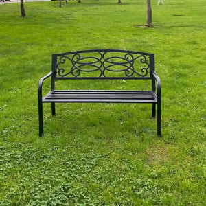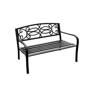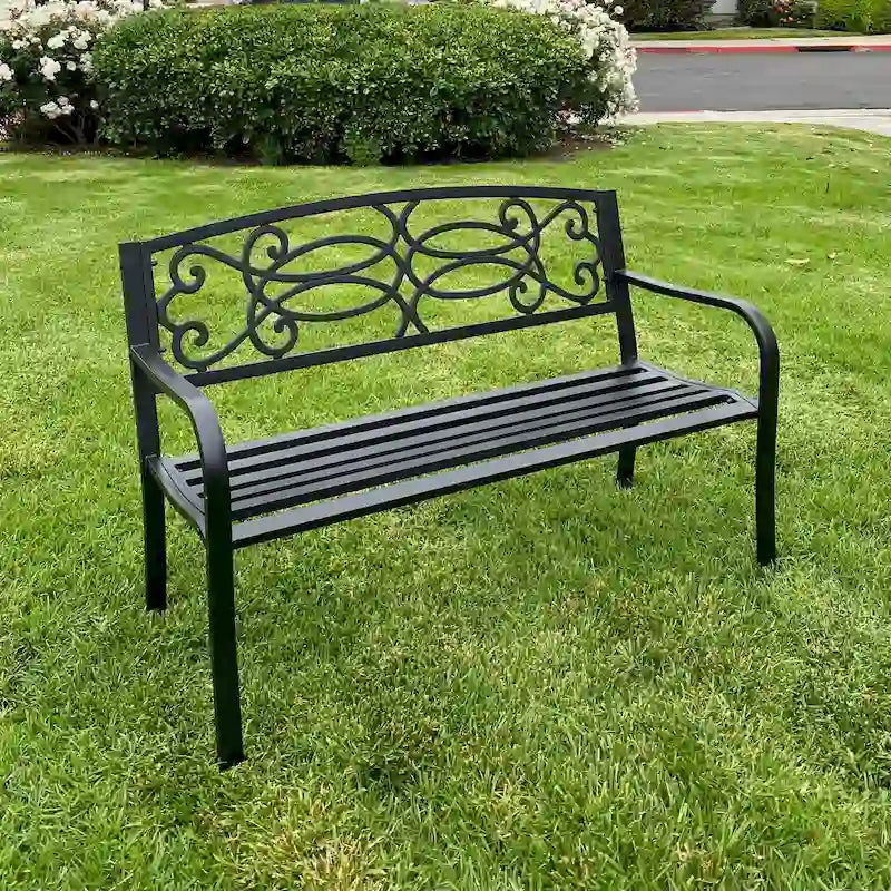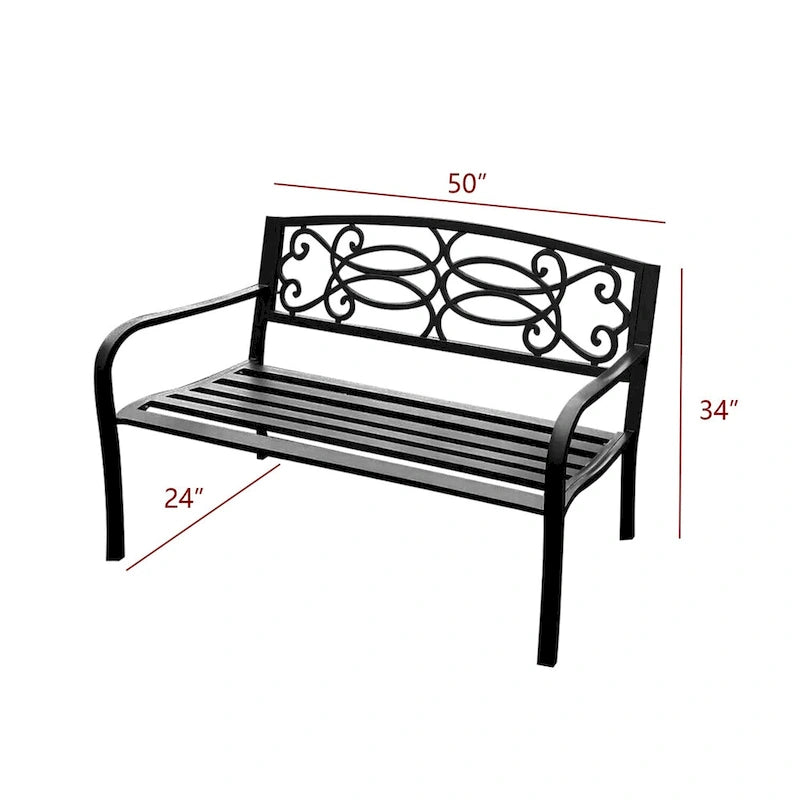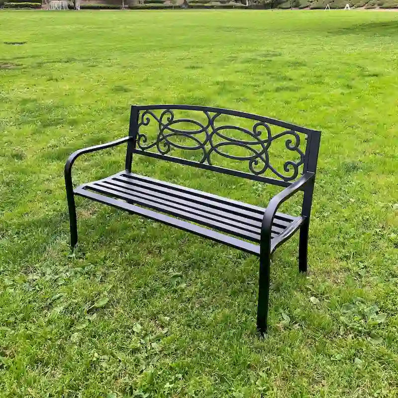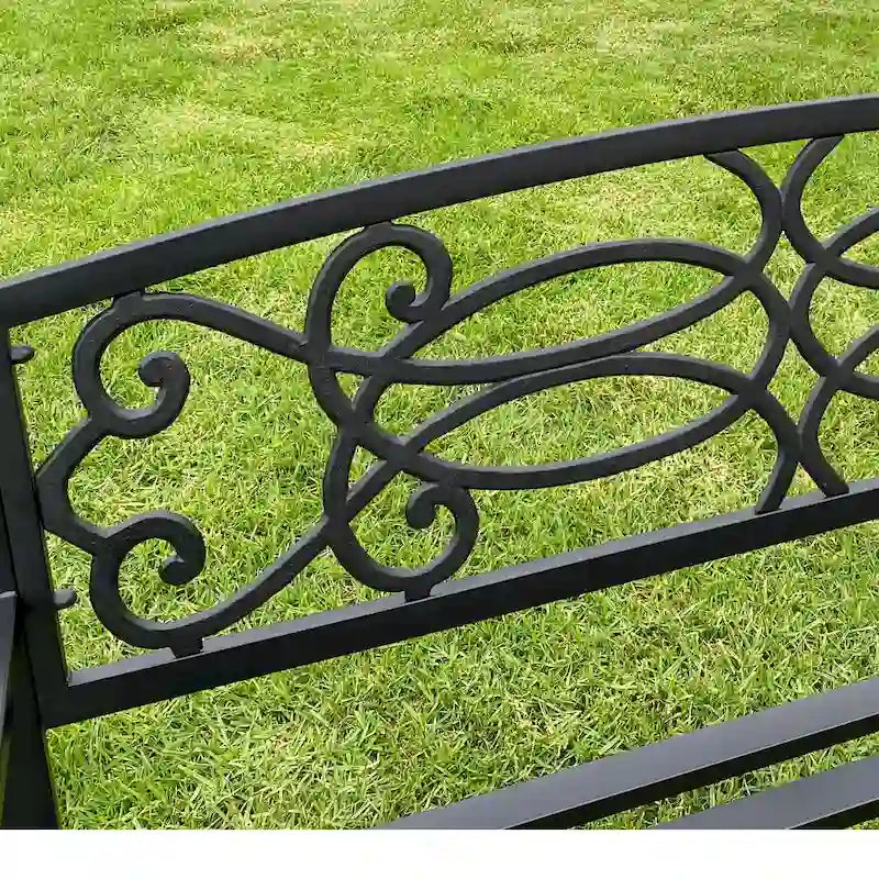 Add a touch of style to your backyard or garden with this beautiful bench. With a slatted seat, and curved arms, this metal frame bench adds a contemporary touch to any outdoor space. The matt black color gives the bench an elegant look that will fit perfectly with any outdoor decor and allow it to maintain its stylish look.