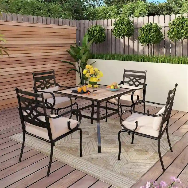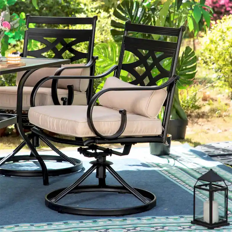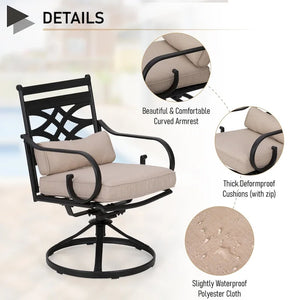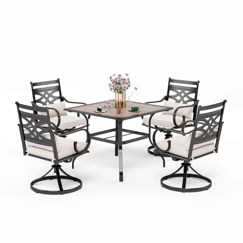 MAISON ARTS Wood-look Table and 4 Pattern Swivel Chairs with Cushion 5-Piece Metal Outdoor Patio Dining Set