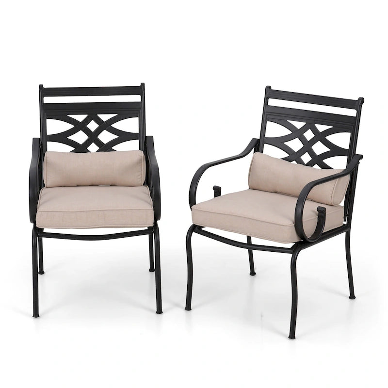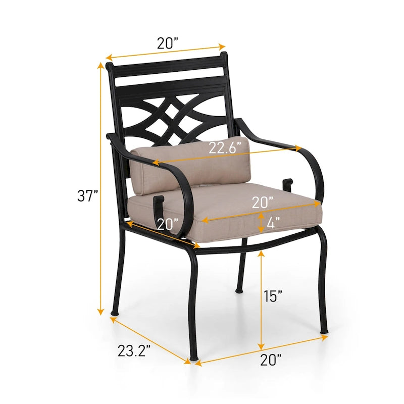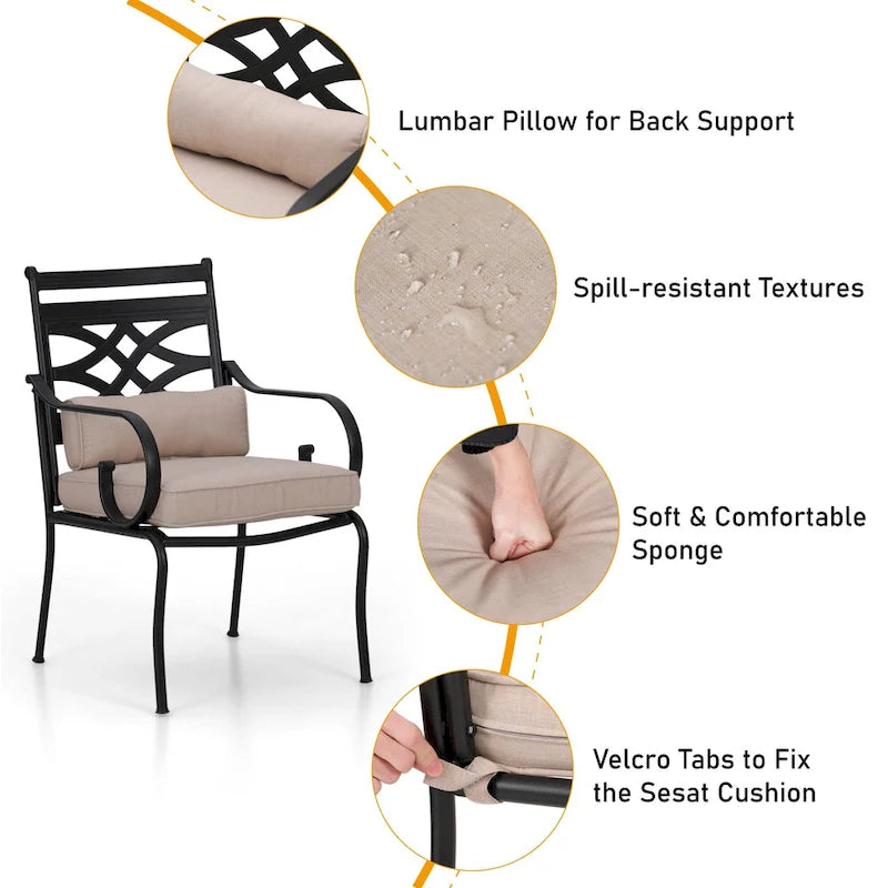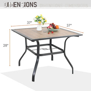 This 5-piece patio metal dining set is a great choice for any outdoor living space. The set includes a square metal table with a PVC tabletop that is both durable and easy to clean, as well as four metal chairs with cushions for added comfort. The umbrella hole in the center of the table allows you to easily add shade during sunny days, while the sturdy metal construction ensures the set can withstand the outdoor elements. The chairs feature a padded seat and backrest covered in weather-resistant cushions, providing a comfortable seating experience.