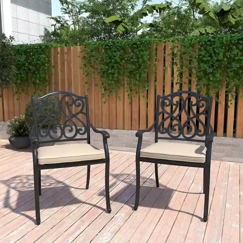 Upgrade your dining with our Patio Vintage Carved Dining Chairs. The chair features an elegant carved back and is constructed with a 5cm thick cushion with a durable olefin cover. Made of cast aluminum, it showcases exceptional weather resistance, ensuring long-lasting durability. It features an elegant black with antique white edges, exuding luxury. It requires no assembly and is ready to use upon delivery, just enjoy your meal!