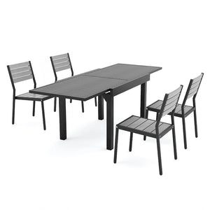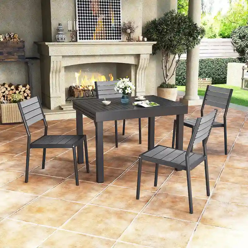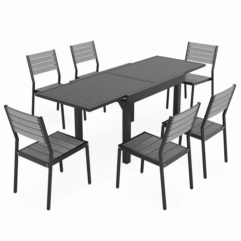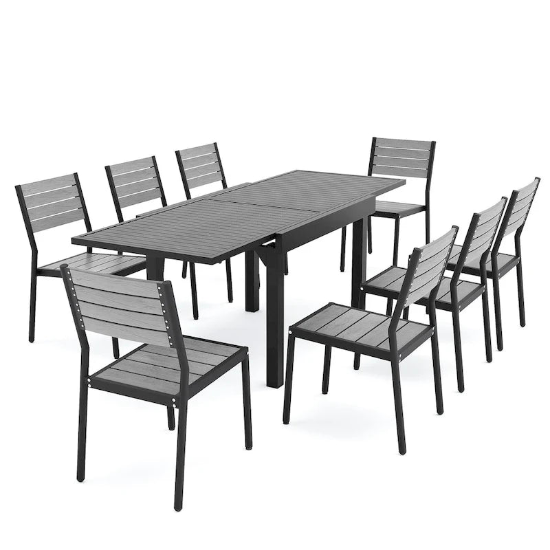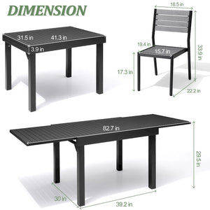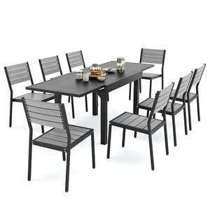 Get ready to enjoy outdoor dining with friends and family with this 5 / 7 / 9 pieces patio dining set. The expandable aluminum dining table can be adjusted according to your needs, and it comes with 4 or 6 or 8 comfortable and elegant chairs. This durable set is ideal for outdoor use and built to last, making it a perfect addition to your garden, porch, or yard.