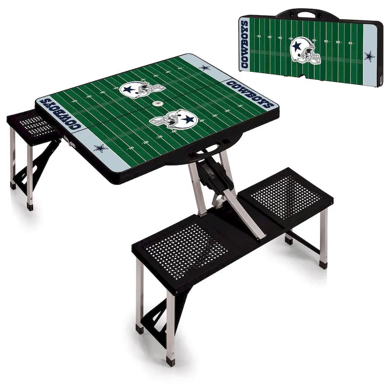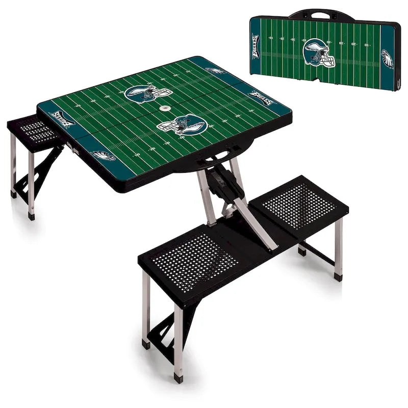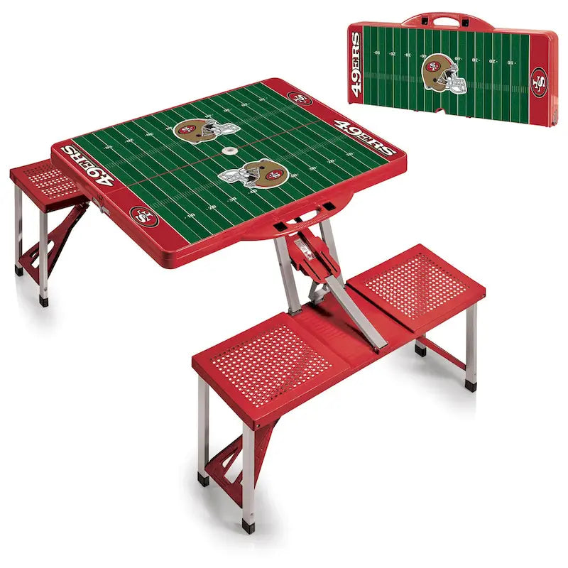 Take your love of football and outdoor dining to the next level with Picnic Time's Portable NFL Picnic Table. This compact table features bench seats for four, a sturdy aluminum frame, and your favorite NFC team's logo and colors. Use it indoors or out, and take advantage of the hole in the center to add some shade with a beach umbrella. With a weight capacity of 250 pounds per seat and a basket weave pattern for comfort, this table is perfect for tailgating, camping, or backyard BBQs.