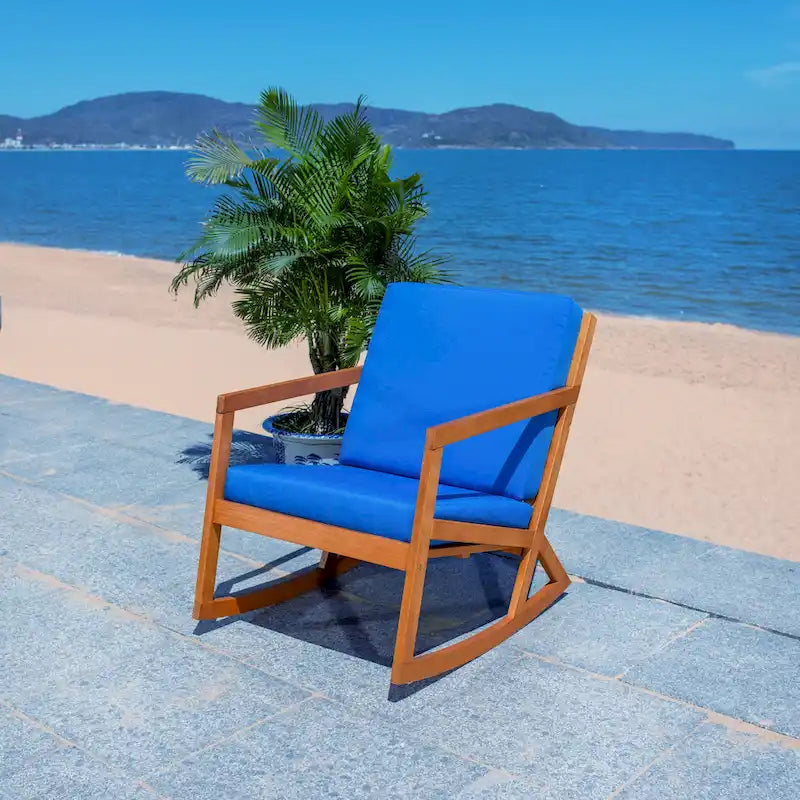 Enjoy the ultimate relaxation experience with the SAFAVIEH Outdoor Vernon Rocking Chair. This handcrafted Shaker-style rocking chair is made of eco-friendly eucalyptus wood with a natural medium brown finish. The easy-care, plush front and back cushions provide ample comfort and seating support. With multiple color options available, you can easily match your outdoor decor.