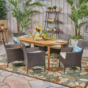 Robust in construction and chic in design, this outdoor dining set for six is the perfect way to take suppertime at your place to the next level. With a table composed of specially-treated acacia wood and wicker chairs woven tightly to withstand the duress of the outdoor elements, this collection is easy to maintain and will last for years to come. No matter what time of day the meal is shared, dining at home in the fresh air has never felt grander.