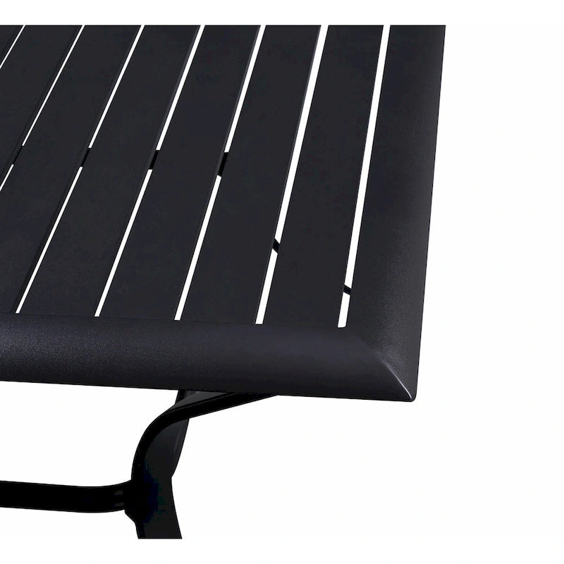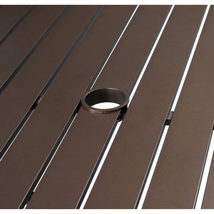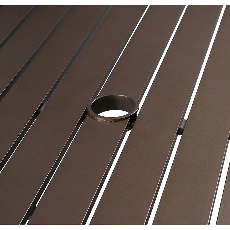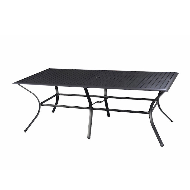 The Westin 9-piece sling dining set includes a slat-top, square cast aluminum table and eight chairs. The Westin set is constructed fully in cast aluminum, a material known for being rust-proof, lightweight, sturdy, low maintenance, and weather resistant. The table has a unique slat top is a great alternative to glass, and includes a 2 inch wide umbrella hole. The table is 42 wide by 82 long with 28 of clearance underneath the table, making it an excellent choice for al fresco family meals. The chairs have a quick-dry fabric for all-weather use, and padded headrests for optimal durability and comfort. The table and chairs have a powder-coated finish.