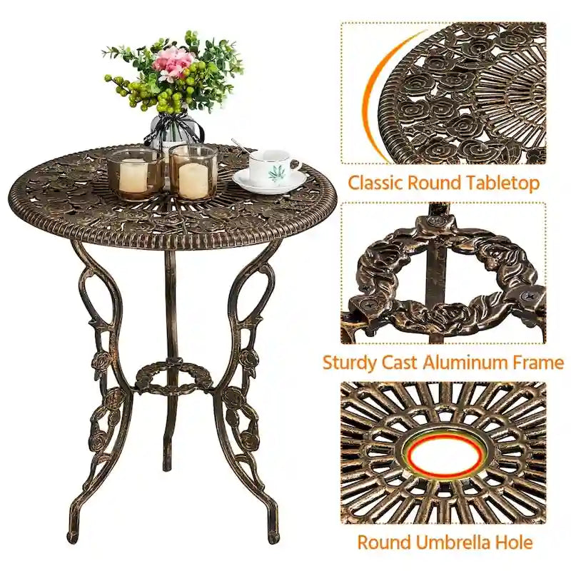 Add vintage charm to your outdoor space with our Yaheetech 3-piece aluminum patio bistro set. With a rose detailed design and floral-petal-shaped backrests, this set is perfect for any garden, lawn, backyard, or patio. The sturdy aluminum construction ensures durability, while the adjustable foot pads provide balance on any surface. The table features an umbrella hole for added convenience and versatility. Get ready to enjoy outdoor dining with this elegant and sturdy bistro set.
